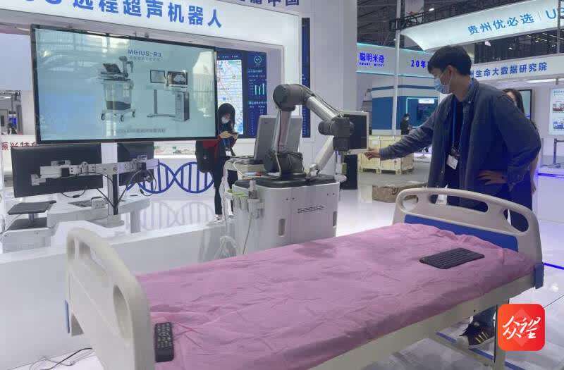5月25日,在数博会展馆内,记者就见到了华大智造自主研发的5G远程超声机器人。现场,一名“患者”躺在病床上,一旁的金属器械手臂正在“开工”。它在“患者”腹部来回滑动,动作轻盈娴熟,俨然一位经验丰富的老医生。
