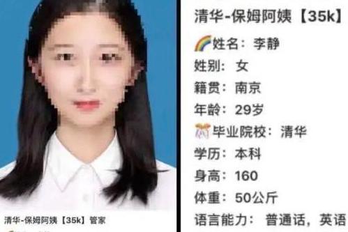 5月26日,一家家政公司在网上发布了一篇题为“清华-保姆阿姨35K管家”的帖子后,引发大量关注。家政公司发布的简历显示:女生年龄29岁,清华毕业,曾做过家庭助理、统筹安排阿姨工作的管家。该家政公司人员称,其学历无假,可在网上查询,工作内容主要是带孩子、做全科辅导,年薪一般在50万左右。在公司发布的其他信息中,也有研究生、“海归”来做保姆管家。