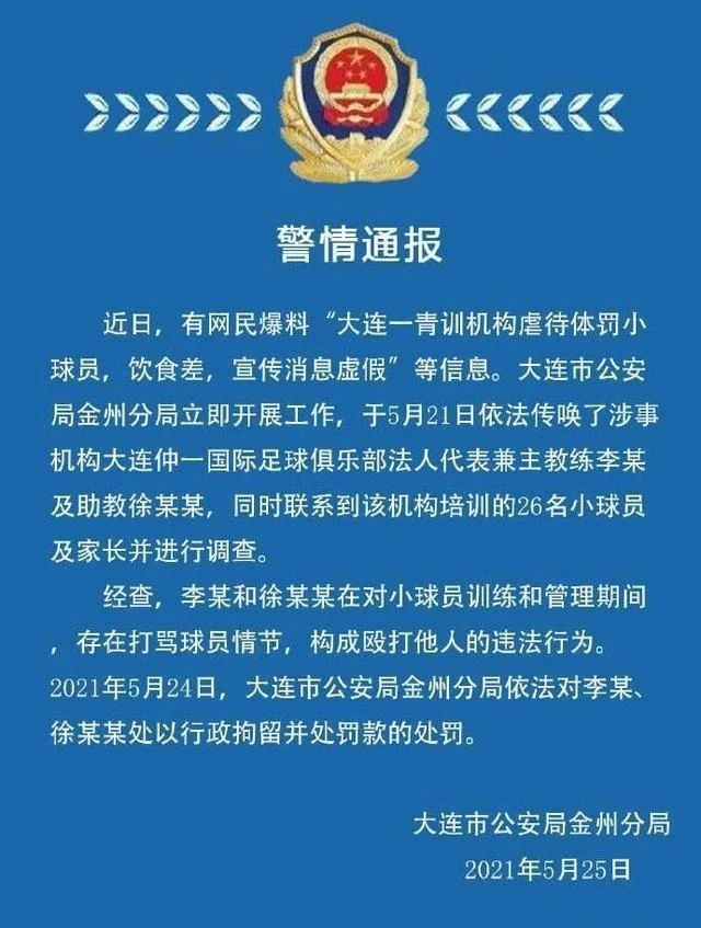 25日,大连市公安局金州分局官博发布警情通报,通报中称,经调查,大连仲一国际足球俱乐部法人代表兼主教练李某及助教徐某某在对小球员训练和管理期间,存在打骂球员情节,构成殴打他人的违法行为。24日,两人被行政拘留并被罚款。