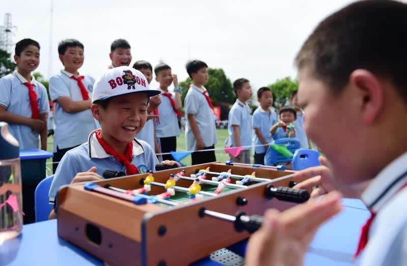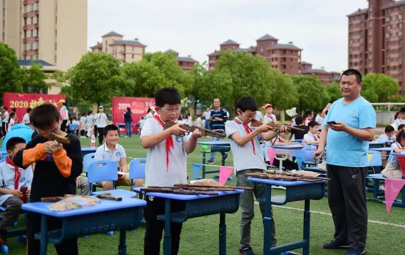 中国青年报客户端讯(中青报·中青网记者 王海涵 王凯 叶赛军)5月27日下午,在合肥市古城小学操场上,一堂“露天党史微课堂”吸引了师生目光。“红船起航”“万里长征”等12个主题的党史微课专区在场内环形排开,各区域均安排1至2名授课老师和1名助教讲述红色历史和英雄事迹。学生们则挑选自己感兴趣的“专区”参与,大家可以进行手工制作、版画拓印等操作,或参与“战斗机组装”等革命历史主题的情境表演。