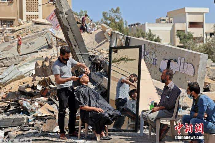 资料图:当地时间5月25日,加沙地区,巴勒斯坦理发师Hashim Al-Jarousha在废墟上为民众理发。