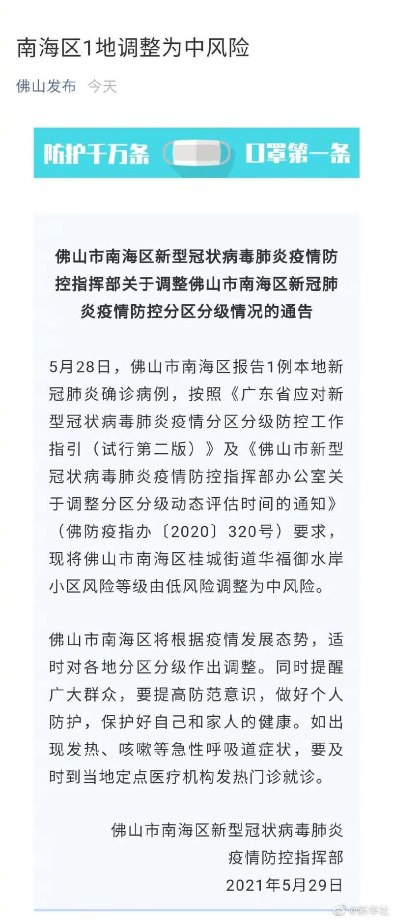 据佛山发布微信公号,5月28日,佛山市南海区报告1例本地新冠肺炎确诊病例,按照《广东省应对新型冠状病毒肺炎疫情分区分级防控工作指引(试行第二版)》及《佛山市新型冠状病毒肺炎疫情防控指挥部办公室关于调整分区分级动态评估时间的通知》(佛防疫指办〔2020〕320号)要求,现将佛山市南海区桂城街道华福御水岸小区风险等级由低风险调整为中风险。