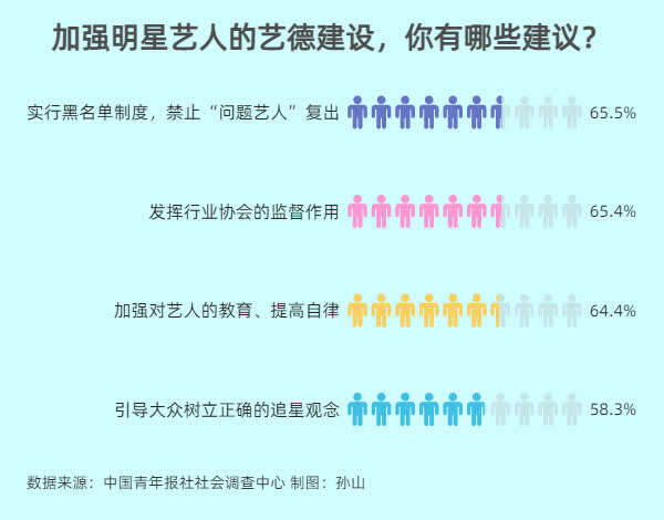 加强明星艺人的艺德建设,调查中,65.5%的受访者建议实行黑名单制度,禁止“问题艺人”复出,65.4%的受访者建议发挥行业协会的监督作用,64.4%的受访者建议加强对艺人的教育、提高自律,58.3%的受访者建议引导大众树立正确的追星观念。