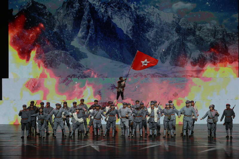 演出以中国共产党百年历史为主线,按时间进程划分为“开天辟地”“改天换地”“翻天覆地”“惊天动地”四个篇章,由活动中心师生同台演出,生动展现中国共产党一百年光辉历程中的重大历史事件和一代代共产党人构筑的精神谱系。