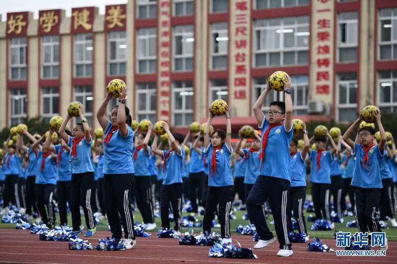 5月31日,河北省滦州市第四实验小学学生下午放学后在操场上练习足球操。新华社记者 牟宇 摄