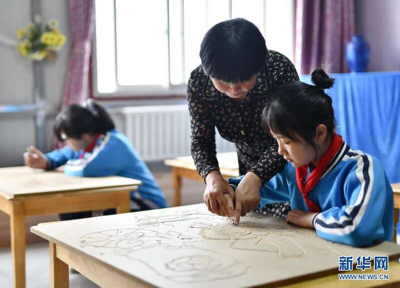 5月31日,河北省滦州市第四实验小学老师在下午放学后指导学生练习版画雕刻。新华社记者 牟宇 摄