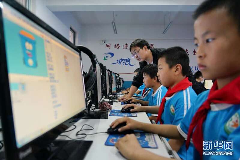 5月31日,河北省滦州市第四实验小学老师在下午放学后指导学生练习计算机编程。新华社记者 牟宇 摄