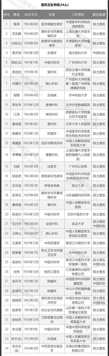 此外,在本次院士增选候选人名单中,医药卫生学部入选人数最多,为34人。其中包括了曾担任武汉雷神山医院院长的泌尿外科专家、武大中南医院院长王行环。