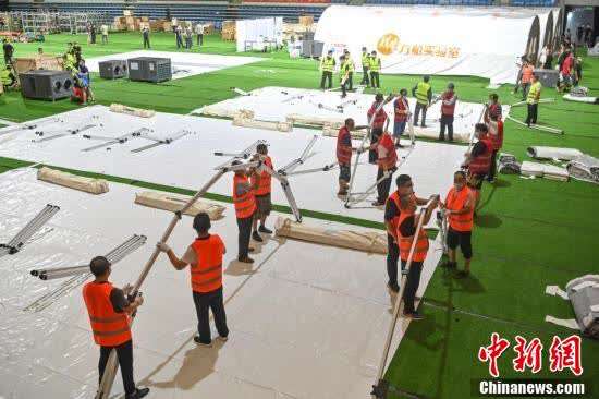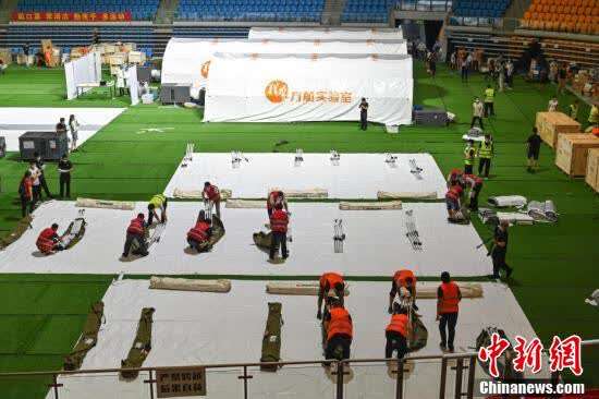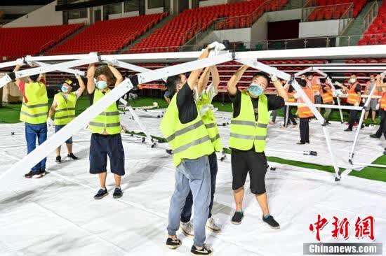6月1日,广东省广州市广州体育馆,工作人员搭建“猎鹰号”气膜方舱实验室。