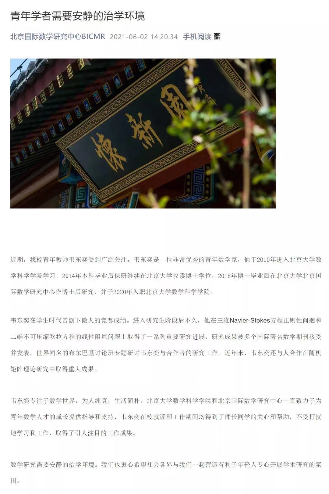 突然的曝光走红,也使得北京大学通过“北京国际数学研究中心BICMR”微信公众号发文回应:韦东奕专注于数学世界,为人纯真,生活简朴。韦东奕在校就读和工作期间均得到了师长同学的关心和帮助,不受打扰地学习和工作,取得了引人注目的工作成果。数学研究需要安静的治学环境。我们也衷心希望社会各界与我们一起营造有利于年轻人专心开展学术研究的氛围。