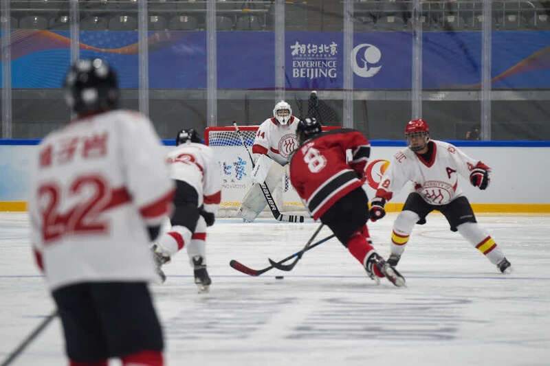 4月2日,运动员在冰球项目测试活动中。新华社记者 彭子洋 摄