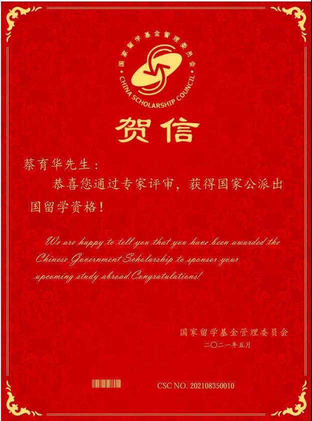 据悉,国家建设高水平大学公派研究生项目按照“选拔一流学生,到国外一流的院校、科研机构或学科专业,师从一流导师”的要求选派留学生,旨在服务国家经济社会发展和人才强国战略,培养一批国家急需的具有国际视野、通晓国际规则,能够参与国际事务和竞争的高层次人才。蔡育华同学能从国内众多优秀申请者中脱颖而出,体现了学校高度重视人才培养和科研团队建设所取得的成效。