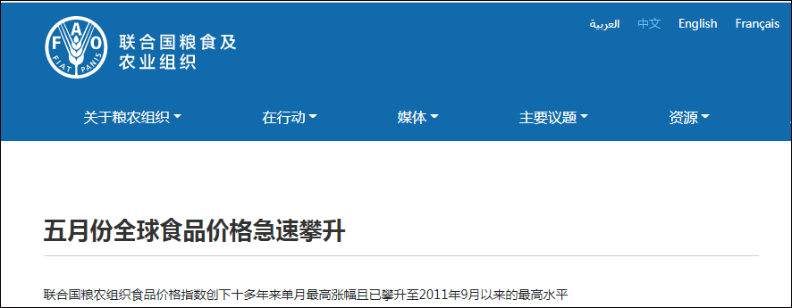联合国粮农组织:全球食品价格连续12个月上涨,达到近十年来最高水平