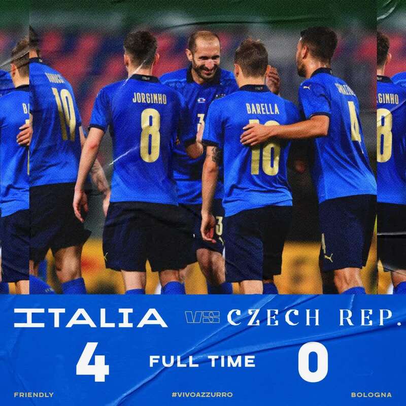 新华社罗马6月4日电 意大利队4日坐镇博洛尼亚与捷克队进行了一场足球热身赛。凭借因莫比莱、巴雷拉、因西涅和贝拉尔迪的进球,“蓝衣军团”4:0大胜对手。
