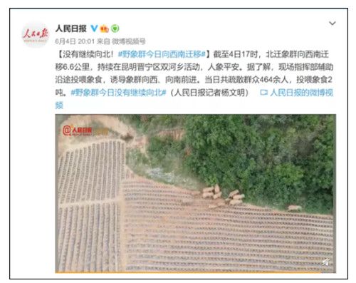 据了解,现场指挥部辅助沿途投喂象食,诱导象群向西、向南前进。
