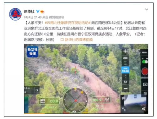 据人民日报、新华社报道,截至4日17时,北迁象群向西南迁移6.6公里,持续在昆明晋宁区双河乡活动,人象平安。