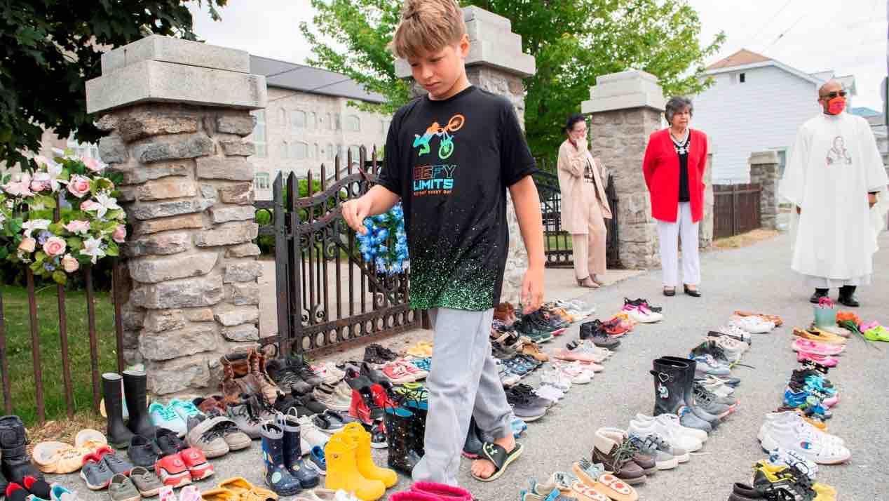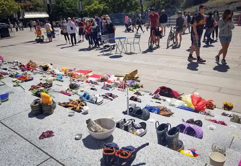 △20210年5月29日,温哥华的人们用摆放的童鞋悼念215个遇害的原住民儿童。
