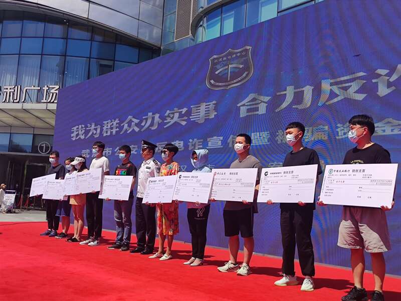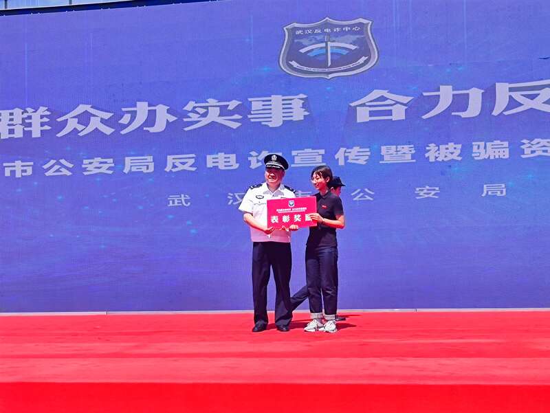 活动现场,武汉警方对反诈宣传成绩突出的武汉工程大学教师翟莹、举报涉诈线索有功的群众等进行奖励。