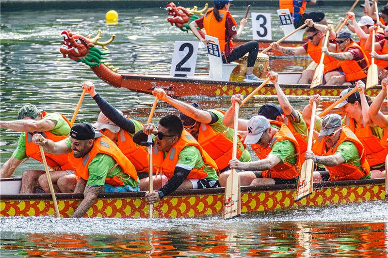 2021年6月12日,“和满京城 奋进九州”2021龙潭端午文化节主场活动在北京龙潭公园举行。通过龙舟比赛、文艺演出等多种形式,让市民和游客体验端午节的多彩民俗。图为在公园内举行的300米混合直道竞速龙舟赛。 中新社记者 贾天勇 摄