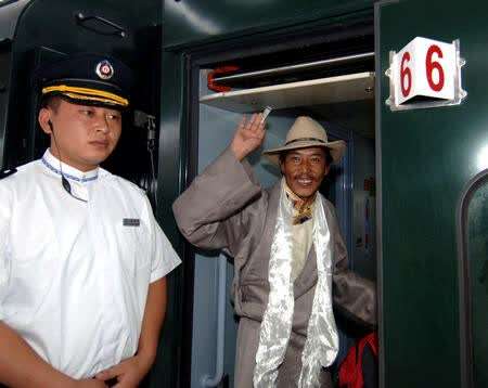 △2006年7月1日,第一位检票登车的乘客——来自拉萨柳梧乡的达瓦桑布——登上庆典列车后向站台上的人们挥手。