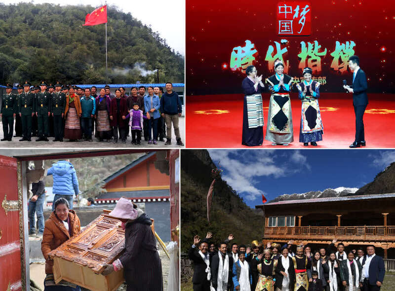 右下:卓嘎、央宗姐妹和玉麦乡干部群众合影。新华社记者 普布扎西 摄