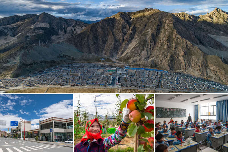 拼版照片:上:位于山南市贡嘎县的森布日搬迁安置点。新华社记者 孙非 摄