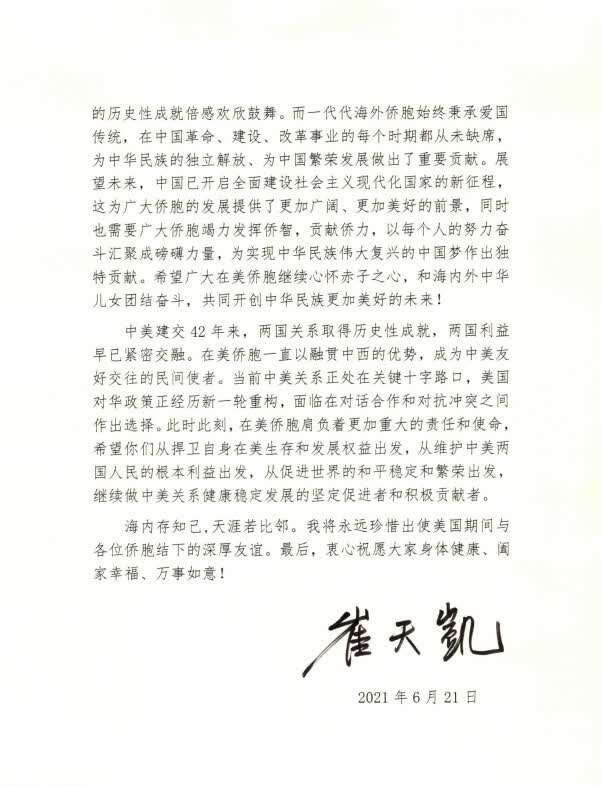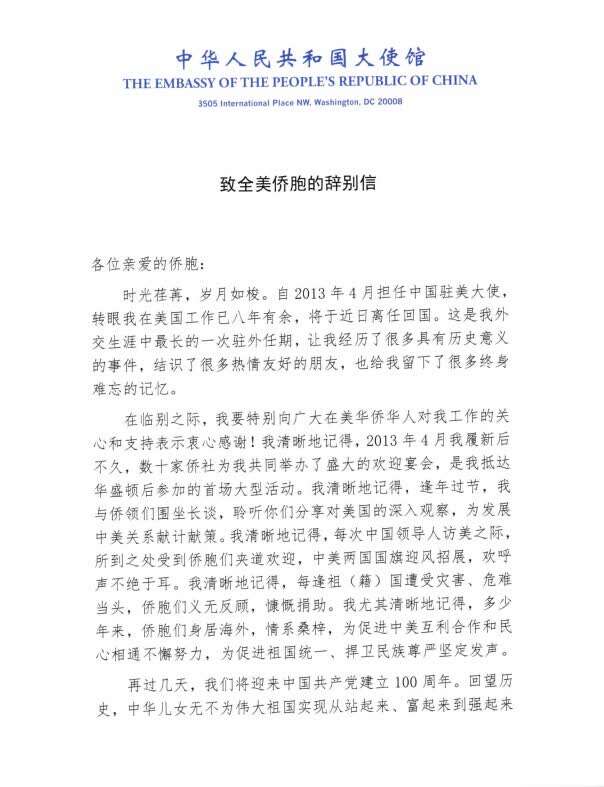 6月21日,中国驻美大使馆发布中国驻美大使崔天凯辞别信。信件全文如下: