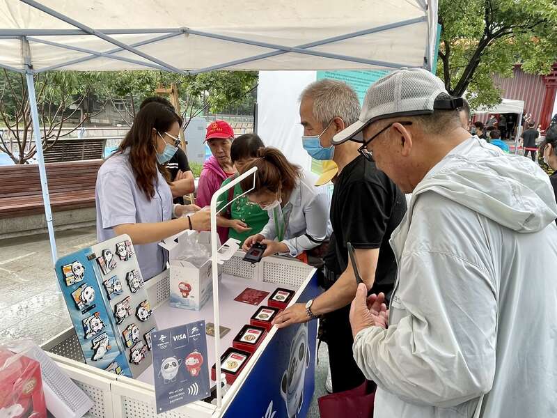 在广场上,市民驻足观看了解冬奥会纪念商品。