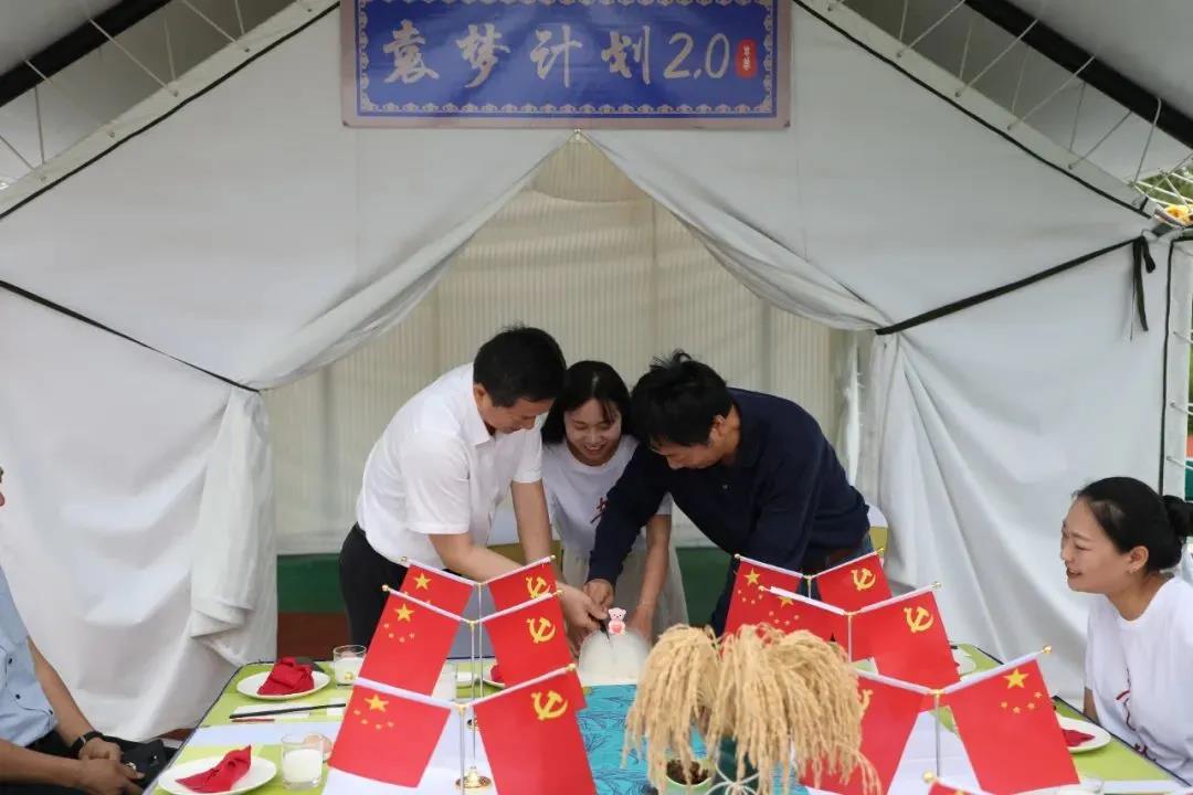 国家杂交水稻工程技术研究中心主任齐绍武(左一)、副主任袁定阳(右一)出席“袁梦计划”第二期发布会,并亲手切开大米蛋糕,宣布启动“袁梦计划”第二期。