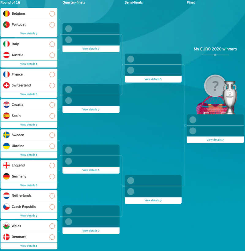 16支入围淘汰赛的球队分别是:A组意大利、威尔士、瑞士;B组比利时、丹麦;C组荷兰、奥地利、乌克兰;D组英格兰、克罗地亚、捷克;E组瑞典、西班牙;F组法国、德国、葡萄牙。