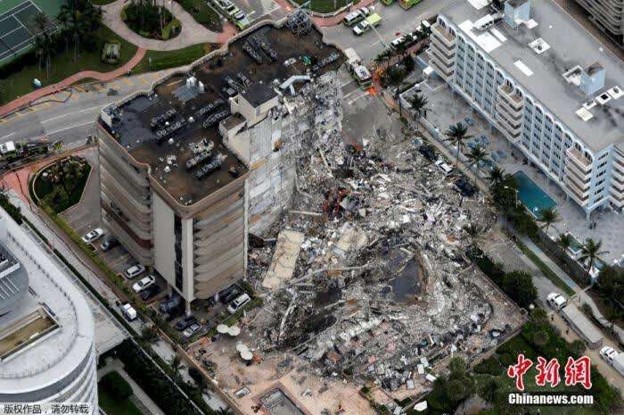 24日凌晨,迈阿密-戴德县瑟夫赛德镇一座高层公寓的居民还在睡梦中时,突然遭遇变故,这栋楼发生了局部坍塌,很多人因此被埋,与外界失去联系。当地官员在24日早上召开的记者会上称,这栋12层的住宅楼有130多套单元,其中大约55套已经倒塌。