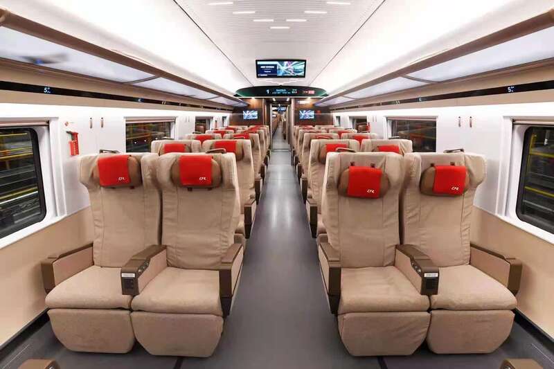 走进车厢,虽然座椅布局没有变化,但每个座椅都根据人体工程学进行了优化,乘坐更舒适。二等车厢的座椅除了保留以前座椅下方的充电设备,椅靠背上也增加了USB充电接口,小桌板杯托的凹槽加深,水杯放着更安全;一等座车厢,座椅增加了可调节头靠、电动腿靠等;商务座车厢座椅交错布置,还配备了支持手机投屏功能的智能交互终端,私密性、便捷性和舒适性都得到提升;无障碍车厢配备了更宽阔的通过门、无障碍卫生间和轮椅放置区等。