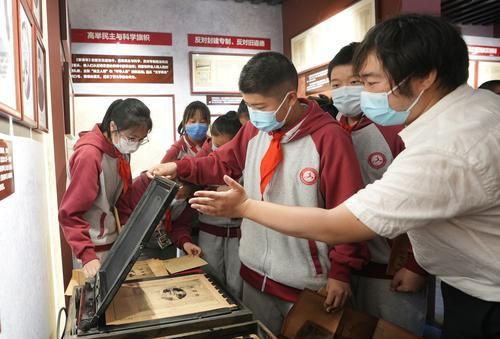 6月1日,北京市第二十七中学学生在《新青年》编辑部旧址(陈独秀旧居)了解展出的油印机。
