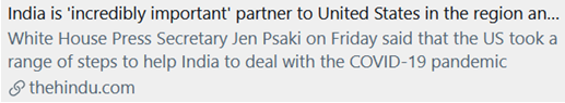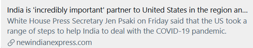 【环球网报道 实习记者 颜玥】据美国白宫官网,白宫新闻秘书普萨基25日在答记者问时表示,印度是美国“非常重要的伙伴”,而且表示美国“当然采取了一系列措施”援助印度。不过网友好像对此番言论并不买账,表示“永远不要相信在背后捅刀子的美国”。