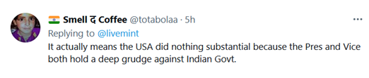 “这实际上意味着美国没有做任何实质性工作,因为(美国)总统和副总统都对印度政府怀有很深的怨恨。”