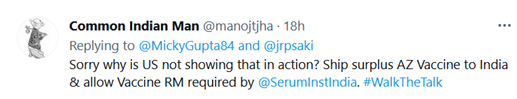 “对不起,为什么美国不在行动中展示这一点?将多余的阿斯利康疫苗运往印度,并提供印度血清研究所要求的疫苗。”