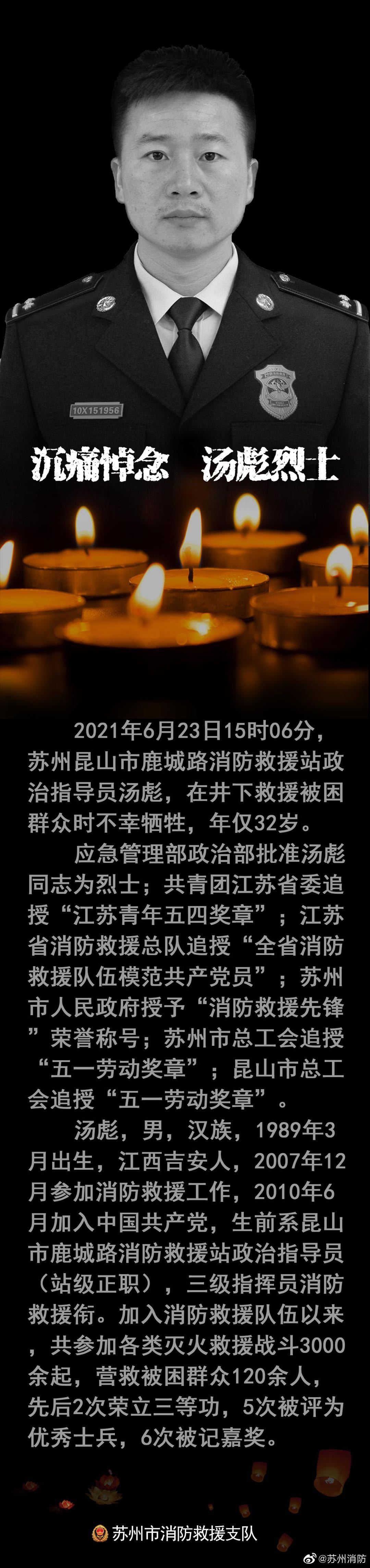 2021年6月23日15时06分,苏州昆山市鹿城路消防救援站政治指导员汤彪在井下救援被困群众时不幸牺牲,年仅32岁。目前,应急管理部已批准汤彪同志为烈士。