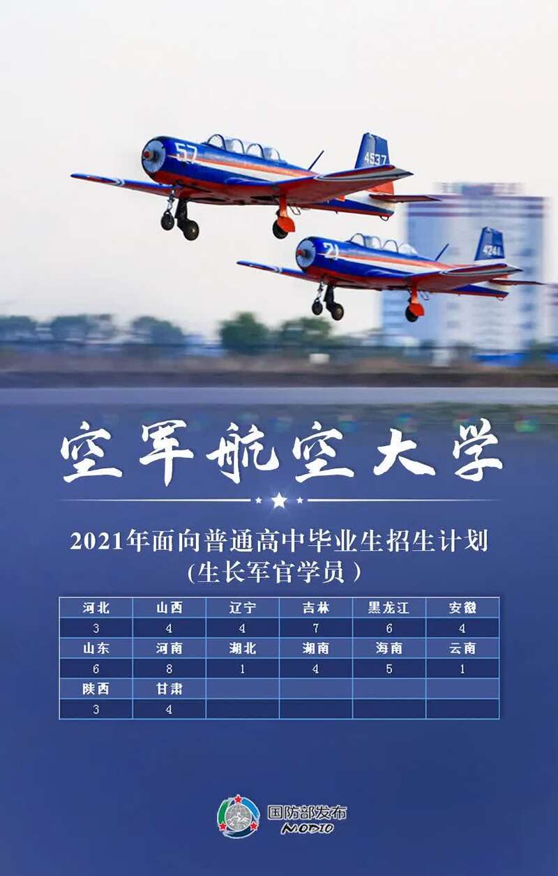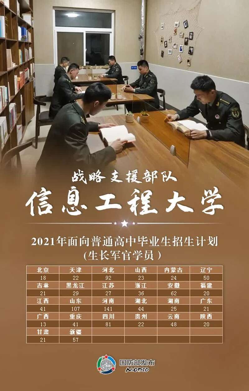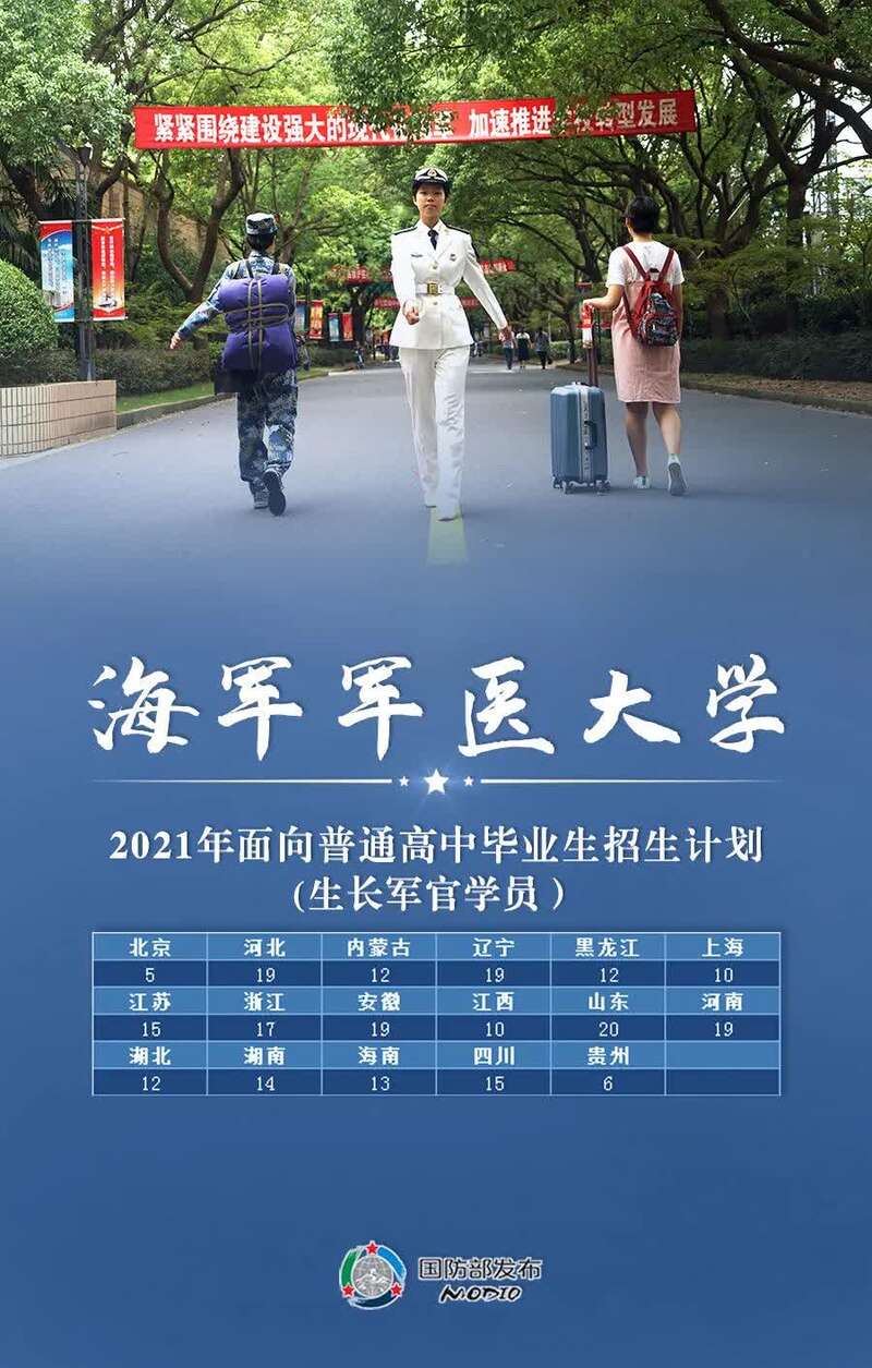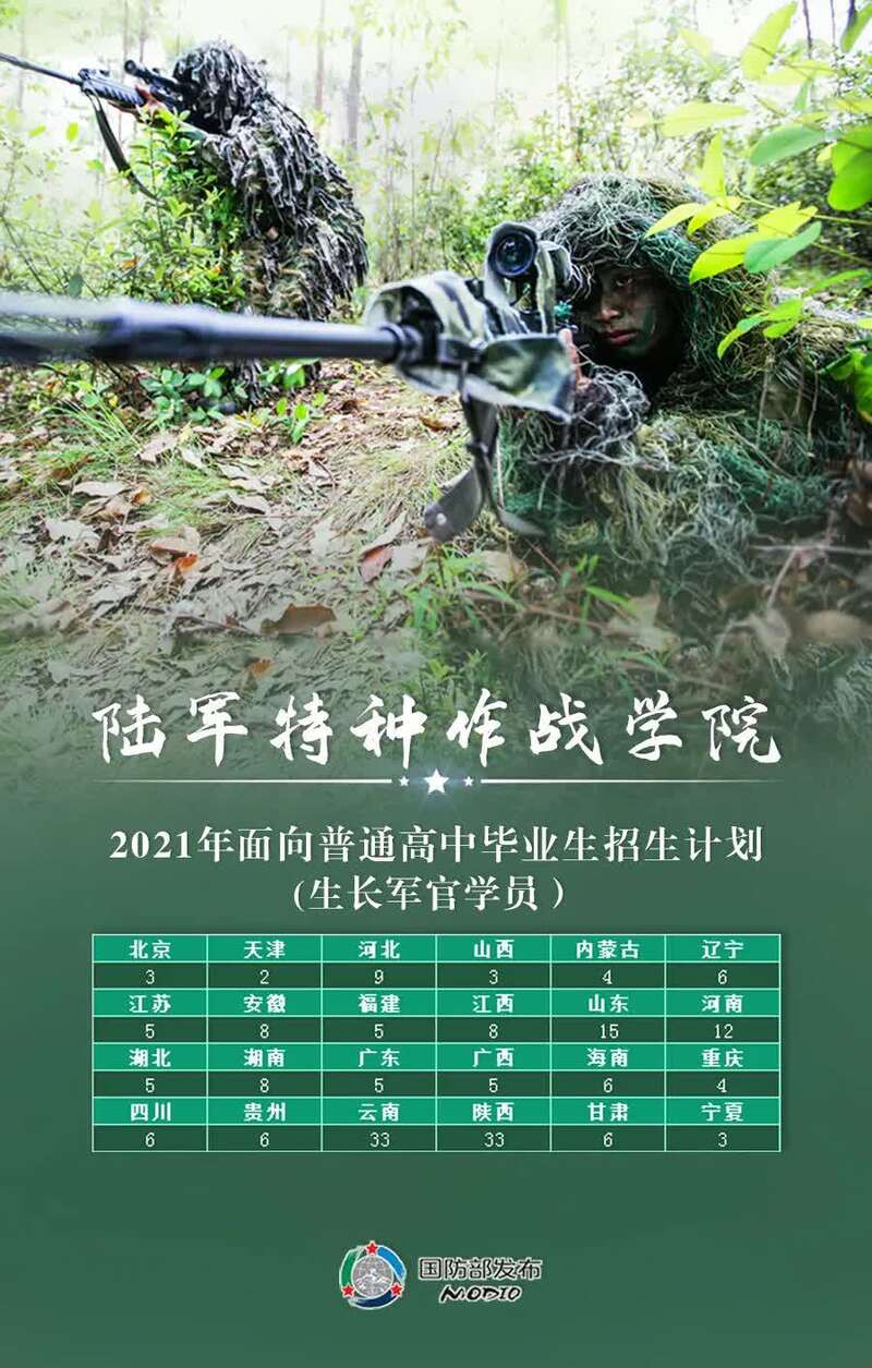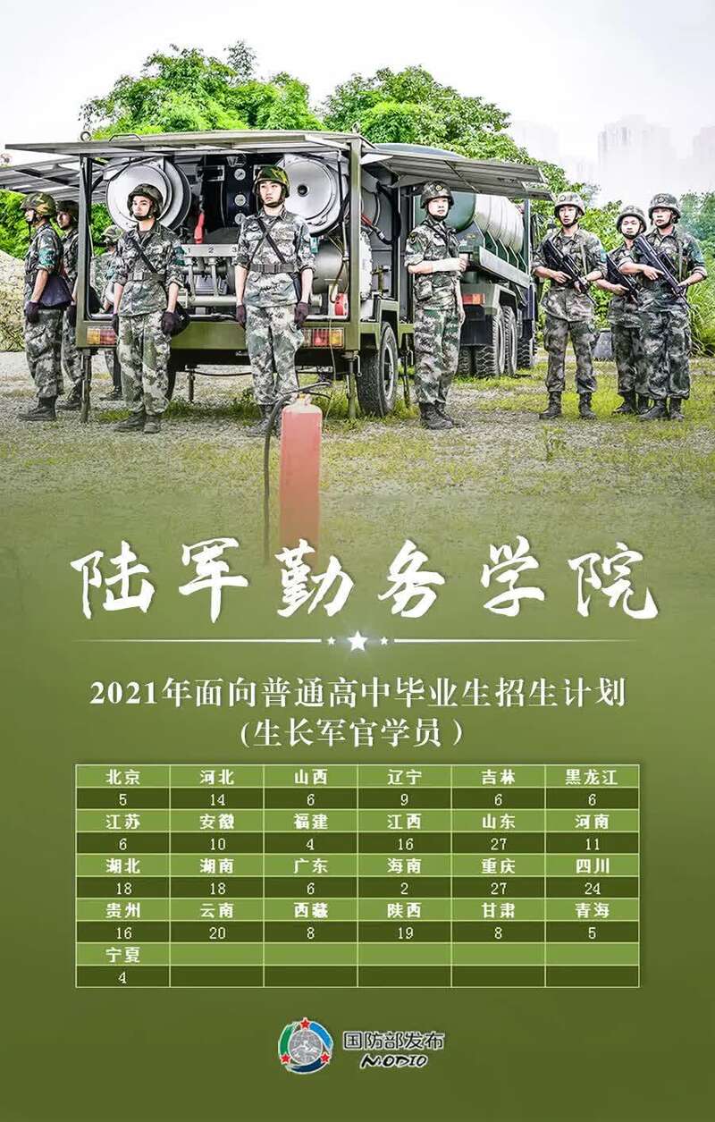 任国强介绍,根据今年军队院校招生计划,共有27所院校招收普通高中毕业生1.3万余人,其中军委直属院校1所、陆军10所、海军5所、空军4所、火箭军1所、战略支援部队2所、武警部队4所。