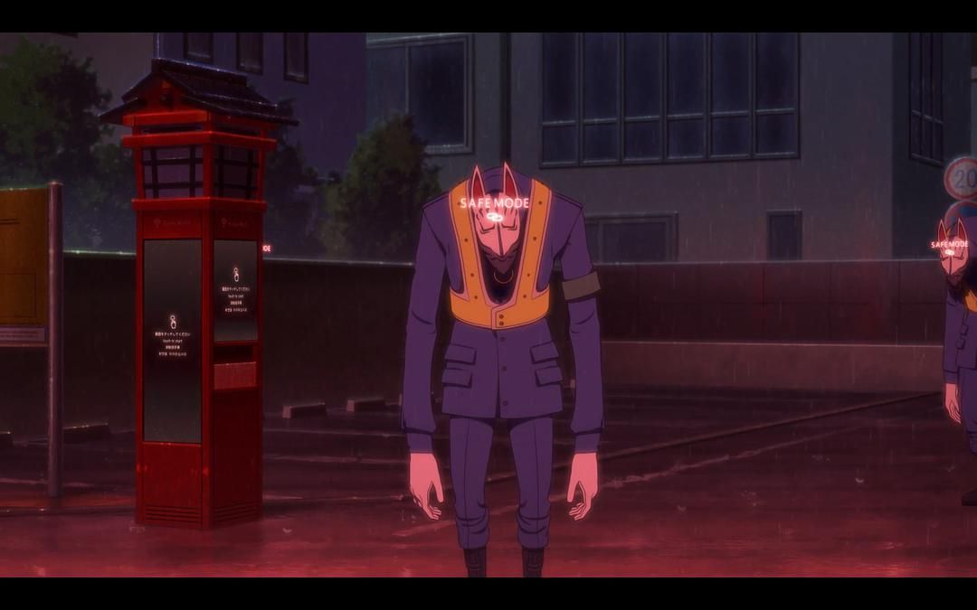 其次,与《黑客帝国》所不同的是,《你好世界》中并不存在一个暗黑的对立面,一个邪恶的控制人类的母体Matrix巨型计算机。《你好世界》中的数字化生存都是打着“科学与管理”的名义,身处京都市政厅内的无限存储空间由一群科学家所维护,他们所做的就是维持复制的数字世界中的秩序,不要出错,不要产生混乱。当有人尝试从真实世界连接虚拟世界,试图改变过去的历史来满足当下需求时,混乱就发生了。重整秩序、修复bug、恢复原状,这些我们听起来没有任何恶意的计算机词汇,在虚拟世界中就演化成一个个、一群又一群“狐面”的宪兵——将数据复原的机器人。