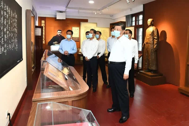 2021年6月25日,习近平、李克强、栗战书、汪洋、王沪宁、赵乐际、韩正等在北大红楼参观“光辉伟业 红色序章——北大红楼与中国共产党早期北京革命活动主题展”。 新华社记者 谢环驰/摄