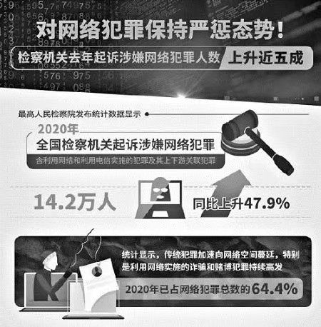 来自最高人民检察院统计数据显示,2020年,全国检察机关起诉涉嫌网络犯罪(含利用网络和利用电信实施的犯罪及其上下游关联犯罪)14.2万人,同比上升47.9%。