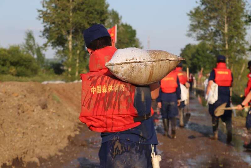 6月23日,黑龙江省森林消防总队大兴安岭地区支队指战员顶着高温在三卡乡加固堤坝。(照片来源:黑龙江省森林消防总队)