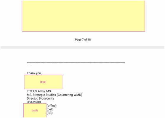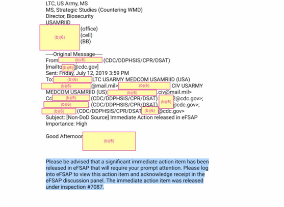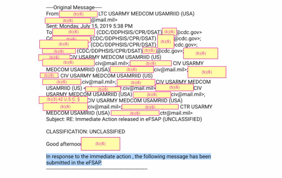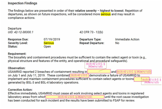 最值得关注的是2019年7月12日至19日期间美国疾控中心和德特里克堡之间的邮件往来。7月12日,美国疾控中心群发给德特里克堡以及其他机构的邮件中说:“请注意,《联邦管制病原计划》(FSAP)电子平台中发布了一项重要的即时行动项目,需要您及时关注。”据介绍,FSAP计划由美国疾控中心特选病原体和毒素处、美国农业部动植物卫生检验局的相关部门负责,主要针对可能对公众、动植物健康或动植物产品构成严重威胁的生物病原体和毒素的拥有、使用和转移进行监管。这些病原体和毒素通常涉及炭疽、天花、腺鼠疫的研究,“因存在潜在危险,所以要确保尽可能安全可靠的实验操作”。7月15日,德特里克堡方面回复邮件称,“为响应立即行动,已在FSAP电子平台中提交以下消息……”然而,《环球时报》记者注意到,正如此前媒体报道,这些“被提交的信息”已被大面积遮盖了。美国疾控中心还提出,“在实体的物理结构和特征以及操作流程保障层面,生物安全和控制流程必须足以遏制特定的药剂或毒素”,而2019 年 7 月 1 日和 7 月 11 日德特里克堡有两次控制流程失败的记录,即针对由 BSL-3实验室和 BSL-4 实验室操作生成的药剂或毒素的控制失效。对此的补救措施是,德特里克堡必须停止所有涉及已注册的特定药剂和毒素的工作,直到根本原因调查清楚。