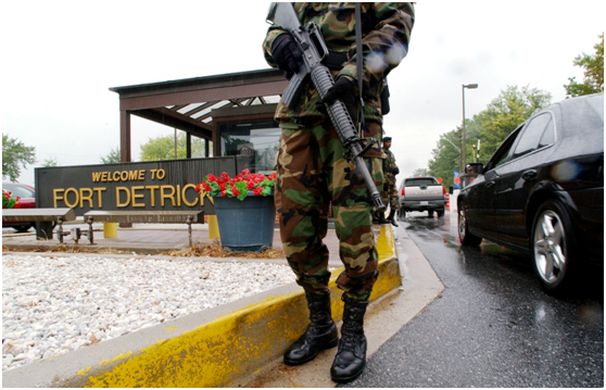 图片说明:持枪军人在德特里克堡美国陆军传染病医学研究所外站岗。