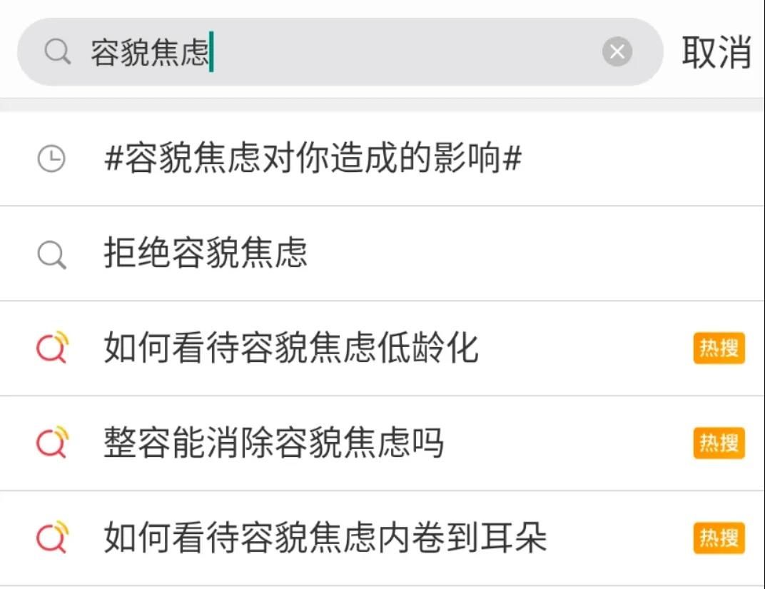 其实“容貌焦虑”在今年已经不是第一次被提起了,在微博搜索框搜索“容貌焦虑”也会出现许多相关的热搜话题。