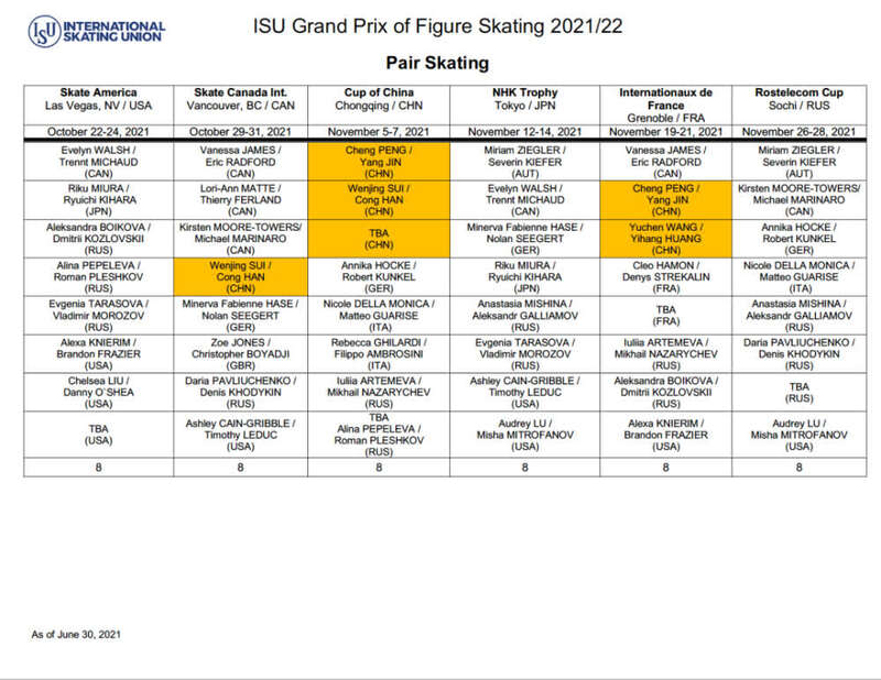 隋文静/韩聪将出战2021/22赛季花滑大奖赛加拿大站和中国站
