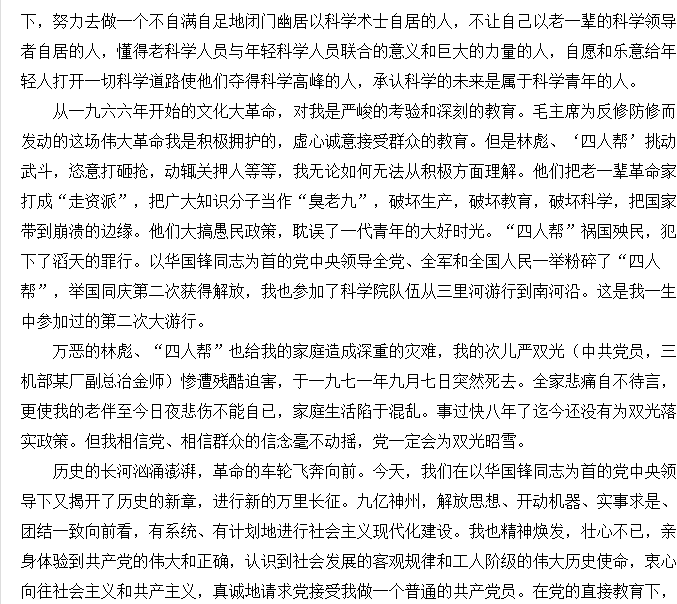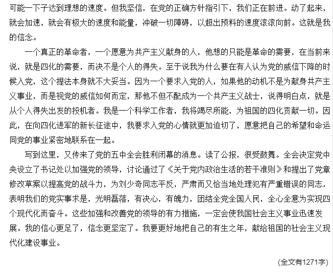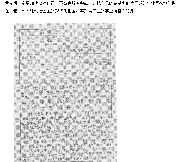 他在入党申请书中深情地写道:九亿神州,解放思想、开动机器、实事求是团结一致向前看,有系统、有计划地进行社会主义现代化建设。我也精神焕发,壮心不已,亲身体验到共产党的伟大和正确,认识到社会发展的客观规律和工人阶级的伟大历史使命,衷心向往社会主义和共产主义,真诚地请求党接受我做一个普通的共产党员。在党的直接教育下我今后一定要加速改造自己,不断克服各种缺点,把自己的希望和命运同党的事业紧密地联系在一起,誓为建设社会主义现代化祖国、实现共产主义事业而奋斗终身!