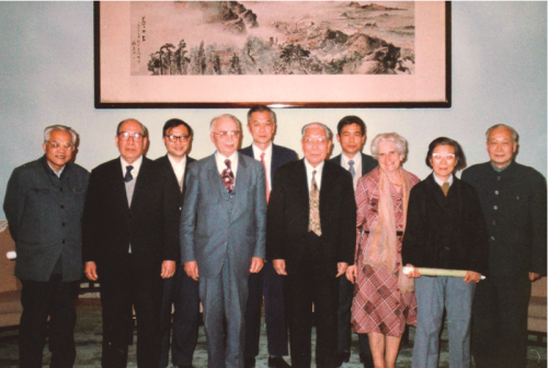 全国人大常委会原副委员长严济慈会见法国数学家H.Carton,左起:吴文俊、汪德昭、成平、H.Carton、严幼光、严济慈、石赫、H.Carton夫人、陈丕和、钱三强。