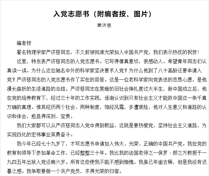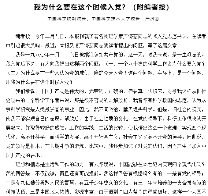 1980年2月9日出版的《中国青年报》刊发严济慈的《入党志愿书》