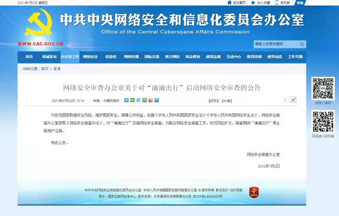 7月2日,网络安全审查办公室发布关于对“滴滴出行”启动网络安全审查的公告称,为防范国家数据安全风险,维护国家安全,保障公共利益,依据《中华人民共和国国家安全法》《中华人民共和国网络安全法》,网络安全审查办公室按照《网络安全审查办法》,对“滴滴出行”实施网络安全审查。为配合网络安全审查工作,防范风险扩大,审查期间“滴滴出行”停止新用户注册。
